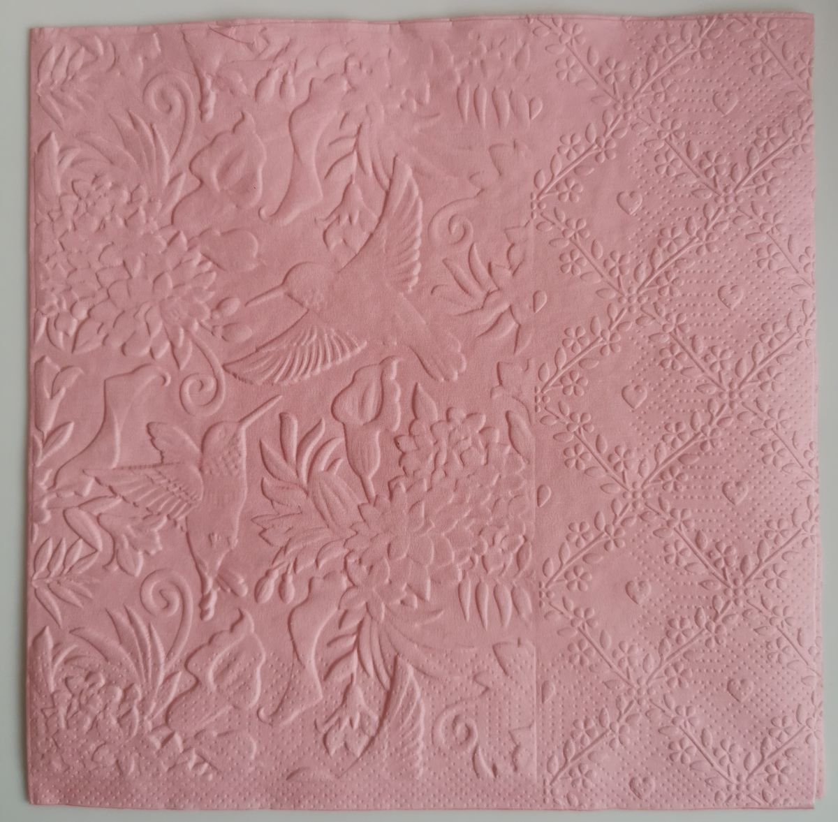 Reliéfne servítky svetloružové (Baby Pink) 33×33 cm, 20 ks – vzor Zaláskané kolibríky