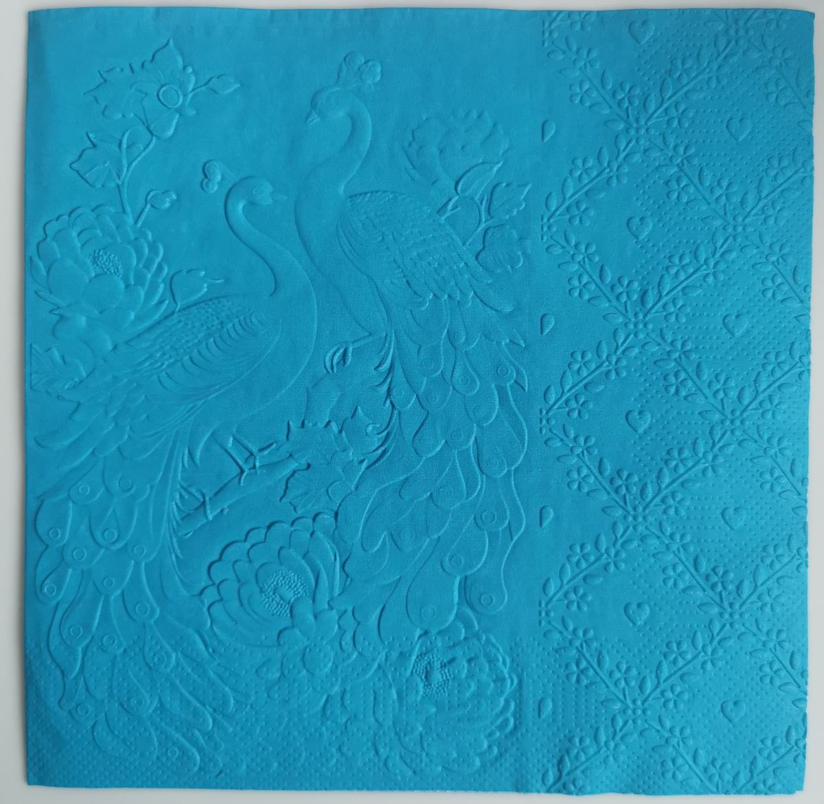 Reliéfne servítky tyrkysové (Blue) 33×33 cm, 20 ks – vzor Zaláskané pávy